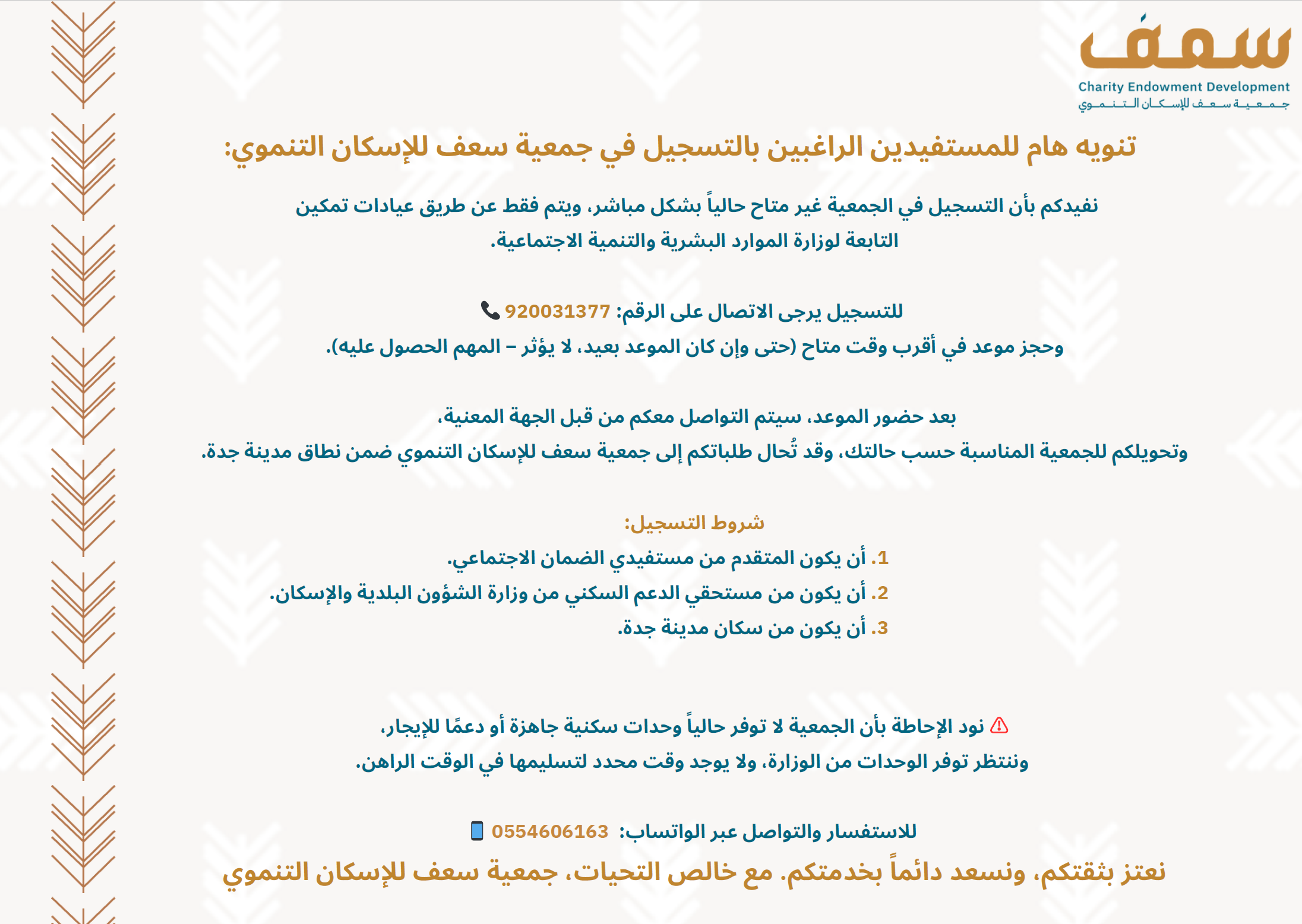 تفي إطار تحديد توجه سعف في المجال الإسكان التنموي عزمت على تقديم نفسها كحاضنة للأسرة من خلال برنامج مجتمع سعف الذي يستطيع أن يضع آلية يخرج عبرها للمجتمع نماذج من الأسر انتقلوا من هاوية الفقر إلى الاستقلال المادي فيكونوا بدورهم حاضنة مستنيرة لأبنائهم مما يكسر دائرة العوز ويعود على المجتمع بفائدة مستدامة لتبرعاته.